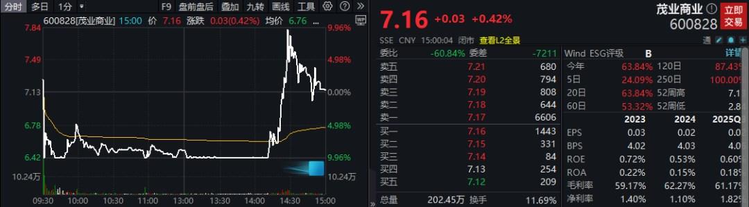 继连续两个交易日涨停后,茂业商业(600828)今日盘中上演“地天板”行情。早盘,该股股价低开下探,多次触及跌停;午后,在大笔买单的推动下,公司股价自跌停板撬起,一路震荡上扬并触及涨停,创近五年新高,但未能封住。截至收盘,该股股价报7.16元/股,微涨0.42%。